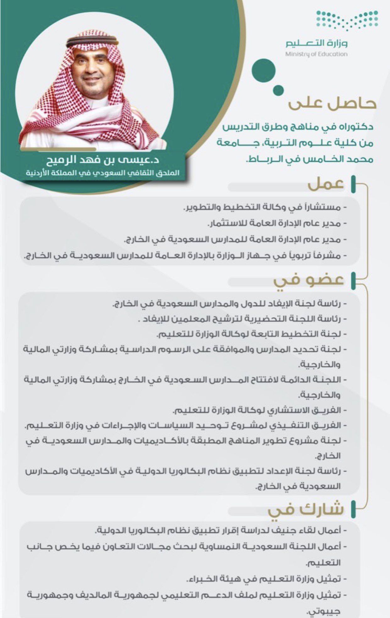 د عيسى بن فهد الرميح On Twitter أتقدم بأسمى آيات الشكر والتقدير لمقام سيدي خادم الحرمين الشريفين وسمو سيدي ولي عهده الأمين على صدور قرار معالي وزير التعليم بتكليفي ملحقا ثقافيا في