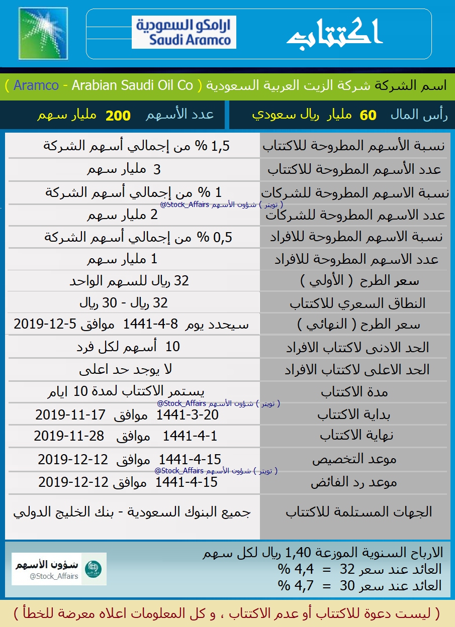شؤون الأسهم On Twitter اكتتاب شركه ارامكو مختصر للتواريخ و الارقام عدد اسهم الاكتتاب فترة الاكتتاب موعد بدايه الاكتتاب نهايه الاكتتاب النسبةالمطروحه للافراد وللشركات سعر الاكتتاب التخصيص و رد الفائض العائد المتوقع لتوزيع الارباح السنوية البنوك