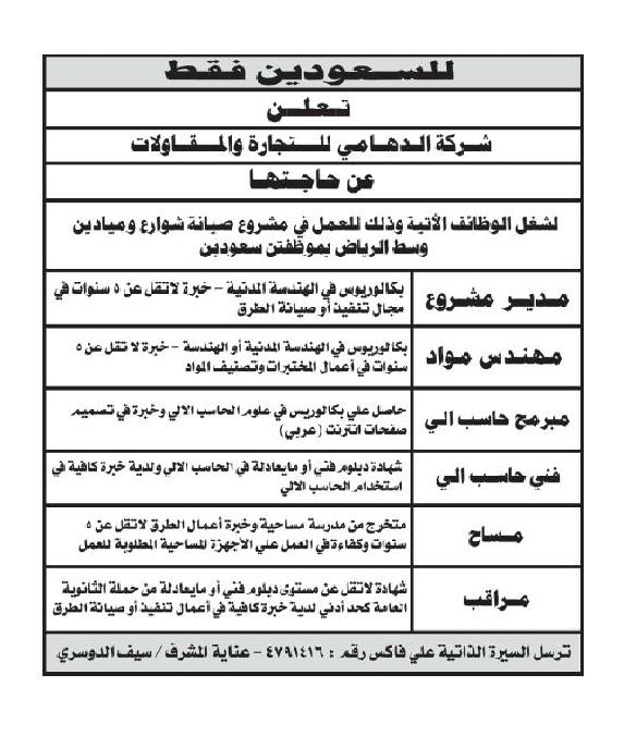 وظائف السعودية وظائف شاغرة فى جريدة الجزيرة 19 جمادى الاول 1433 وظائف فى شركة بالرياض وظائف شركة الدهامى للتجارة والمقاولات وظائف شركة مقاولات وظائف شركة حراسات
