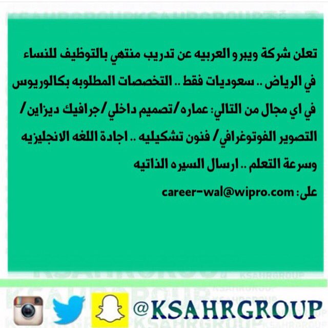 مشاركةللمواردالبشرية On Twitter تعلن شركة ويبرو العربيه عن تدريب منتهي بالتوظيف للنساء في الرياض مشاركة للموارد البشرية Career Wal Wipro Com